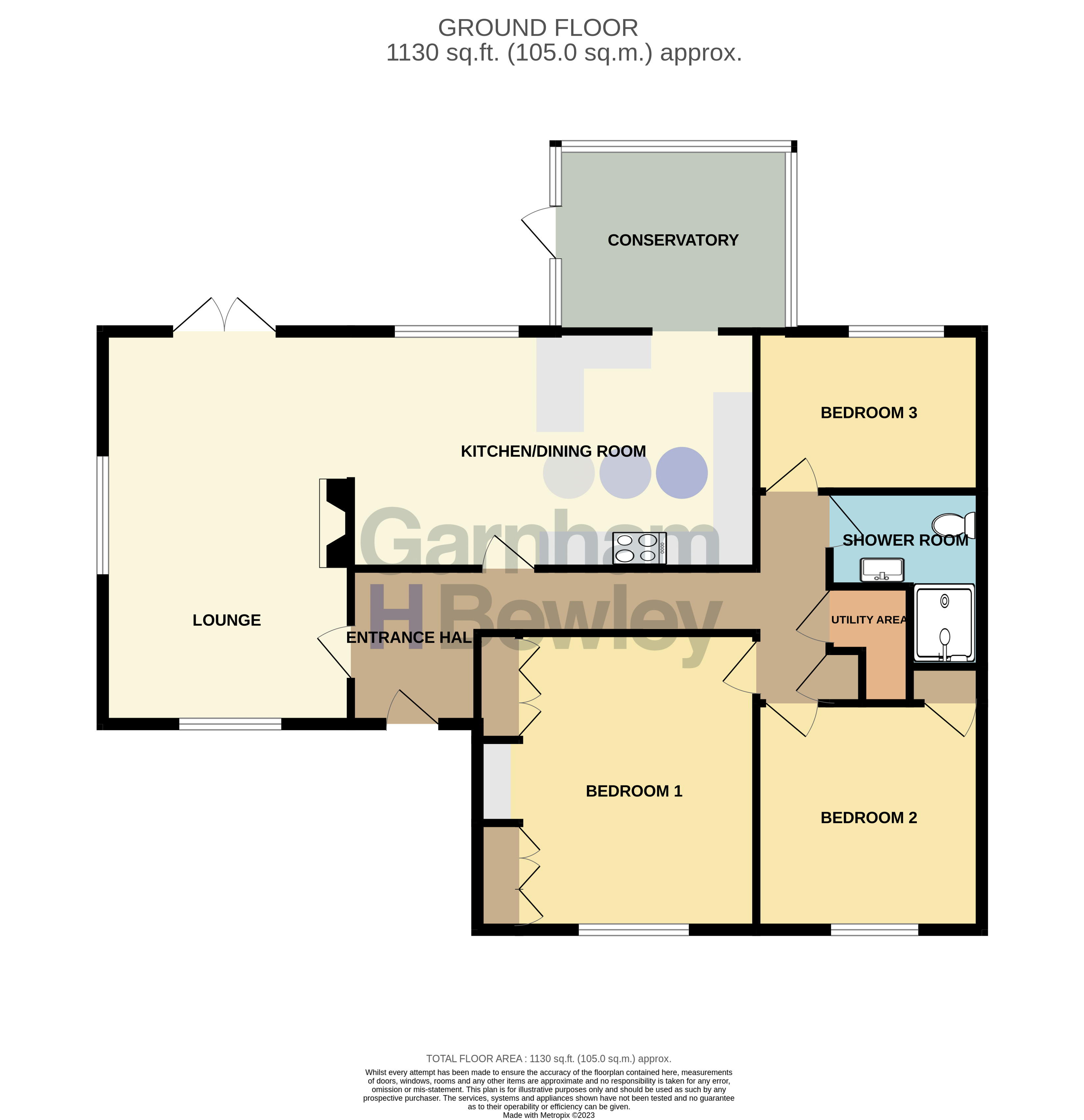 The accommodation consists of front door into entrance hall with doors leading to all principal rooms. The lounge spreads from the front to the rear of the property with a feature fireplace, double aspect windows and French doors leading to the garden. The kitchen/dining room has been fitted with a range of wall and base level units with areas of work surfaces, breakfast bar, integrated oven, microwave, electric hob with extractor hood above, dishwasher, space for American style fridge/freezer open plan to the lounge and conservatory which has French doors leading to the garden. The main bedroom and bedroom two are set to the front aspect with the main bedroom benefitting from fitted wardrobes and bedroom two has a built in wardrobe. Bedroom three overlooks the rear garden. The shower room has been stylishly finished with a double shower cubicle, wash hand basin with vanity unit, low level W.C., heated towel rail, fully tiled walls and window to the side aspect. There is also the ever handy utility area with space for washing machine.