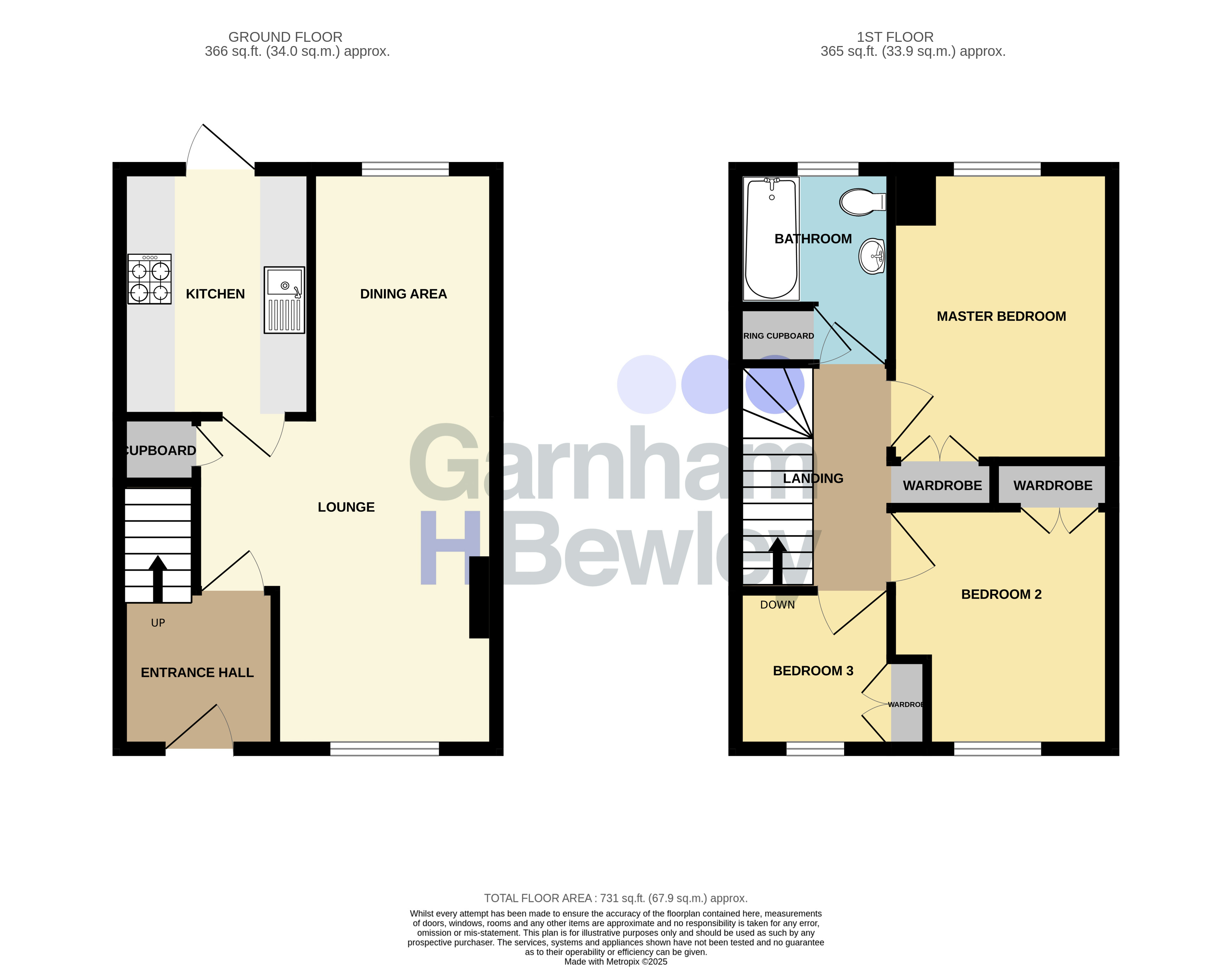 First Floor: The first-floor landing leads to three well-proportioned bedrooms. The master bedroom benefits from built-in wardrobes and a rear aspect window with garden views. Bedroom two, located at the front, also includes built-in storage, while bedroom three features a front aspect window and built in wardrobe. The bedrooms are served by a family bathroom fitted with a panel-enclosed bath, wash hand basin, low-level WC, and a window to the rear aspect.