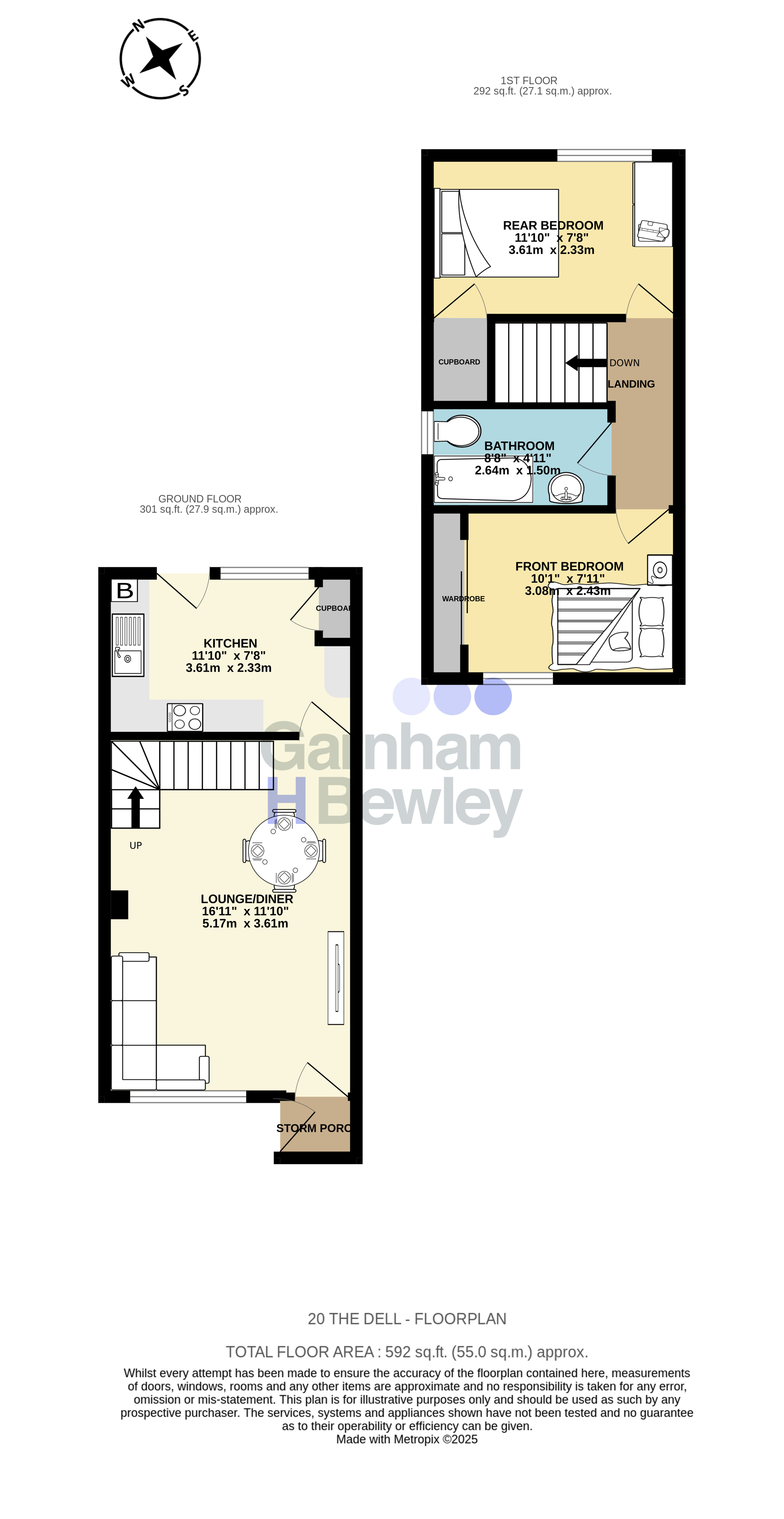 Upstairs, the home offers two double bedrooms, with the front bedroom benefiting from fitted wardrobes. The family bathroom comprises a panel-enclosed bath, hand basin, and low-level WC, complemented by a side-aspect window.