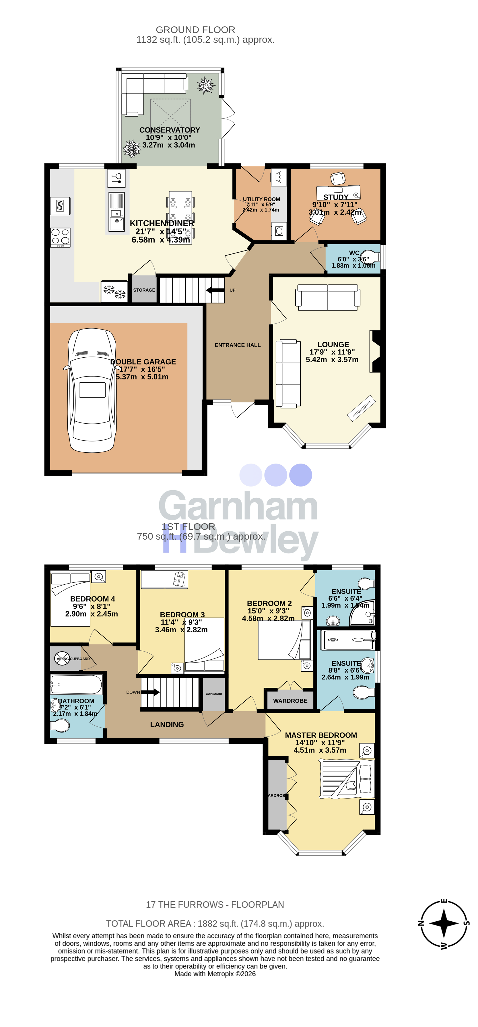 The original dining area has been cleverly modified to open into a large conservatory, which enjoys an abundance of natural light and double side doors opening onto the garden. Upstairs, the first floor offers four well-proportioned double bedrooms. The two principal bedrooms both benefit from built-in wardrobes and their own ensuite shower rooms. The remaining two bedrooms are served by a modern family bathroom, comprising a panel-enclosed bath, low-level WC, wash hand basin and heated towel rail.