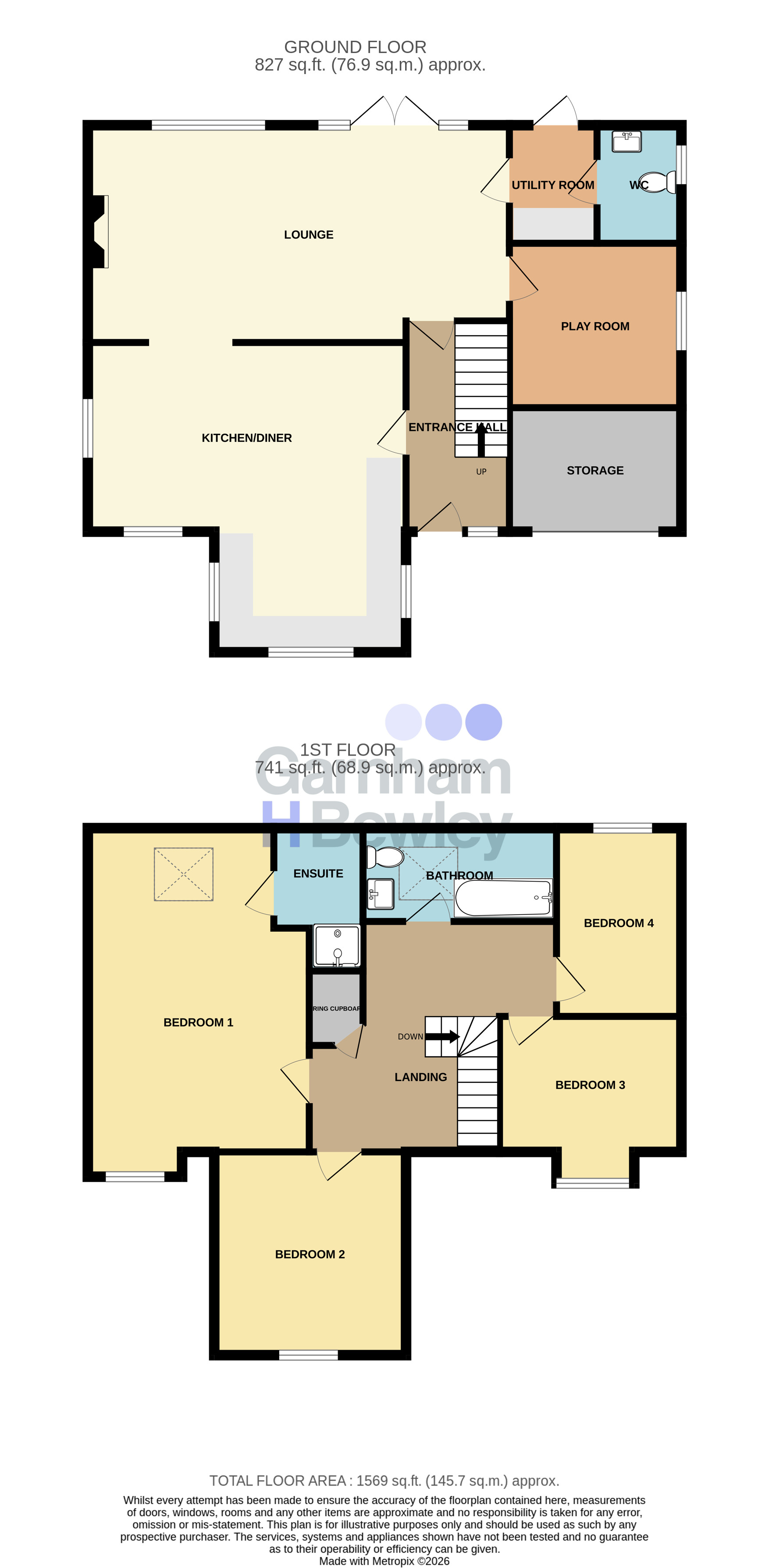 The ground floor comprises a spacious living room featuring an attractive fireplace, creating a welcoming space ideal for relaxing or entertaining. The modern kitchen/breakfast room is particularly impressive, offering ample worktop and storage space along with room for a 6–8 seater dining table. There is direct access to the playroom which is versatile in its use. A utility area and downstairs WC are located to the rear of the property, adding further practicality.