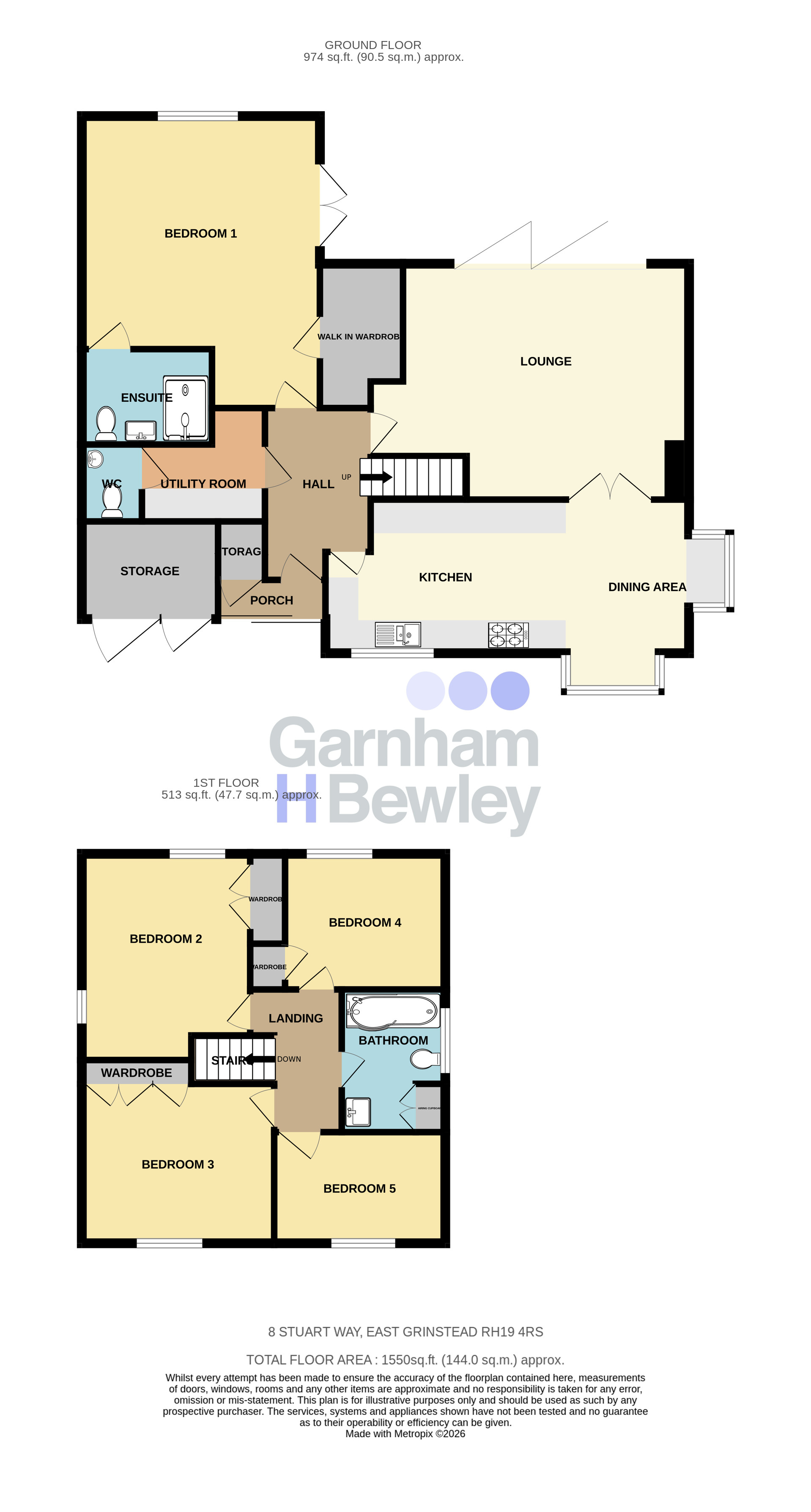The accommodation briefly comprises: an entrance porch leading to a spacious reception hall; a practical utility room fitted with wall and base units, sink and drainer, and a downstairs cloakroom. The dual-aspect kitchen/dining room features a range of wall and base units, integrated appliances, sink and drainer, attractive bay windows to the front and side aspects, and French doors opening into the living room. The generously sized living room benefits from bi-folding doors providing seamless access to the rear garden. Completing the ground floor is a dual-aspect principal bedroom with views over the rear garden, French patio doors, a walk-in wardrobe, and an en-suite shower room.