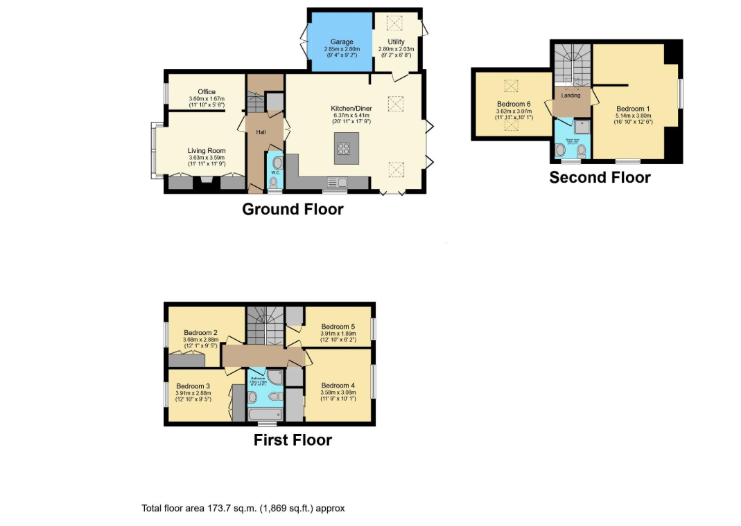 Upstairs, the first floor offers four well-proportioned bedrooms, including an impressive principal suite, alongside a modern family bathroom. The second floor provides two further bedrooms (or an ideal guest suite setup) and an additional bathroom, offering excellent flexibility for growing families or multi-generational living.
