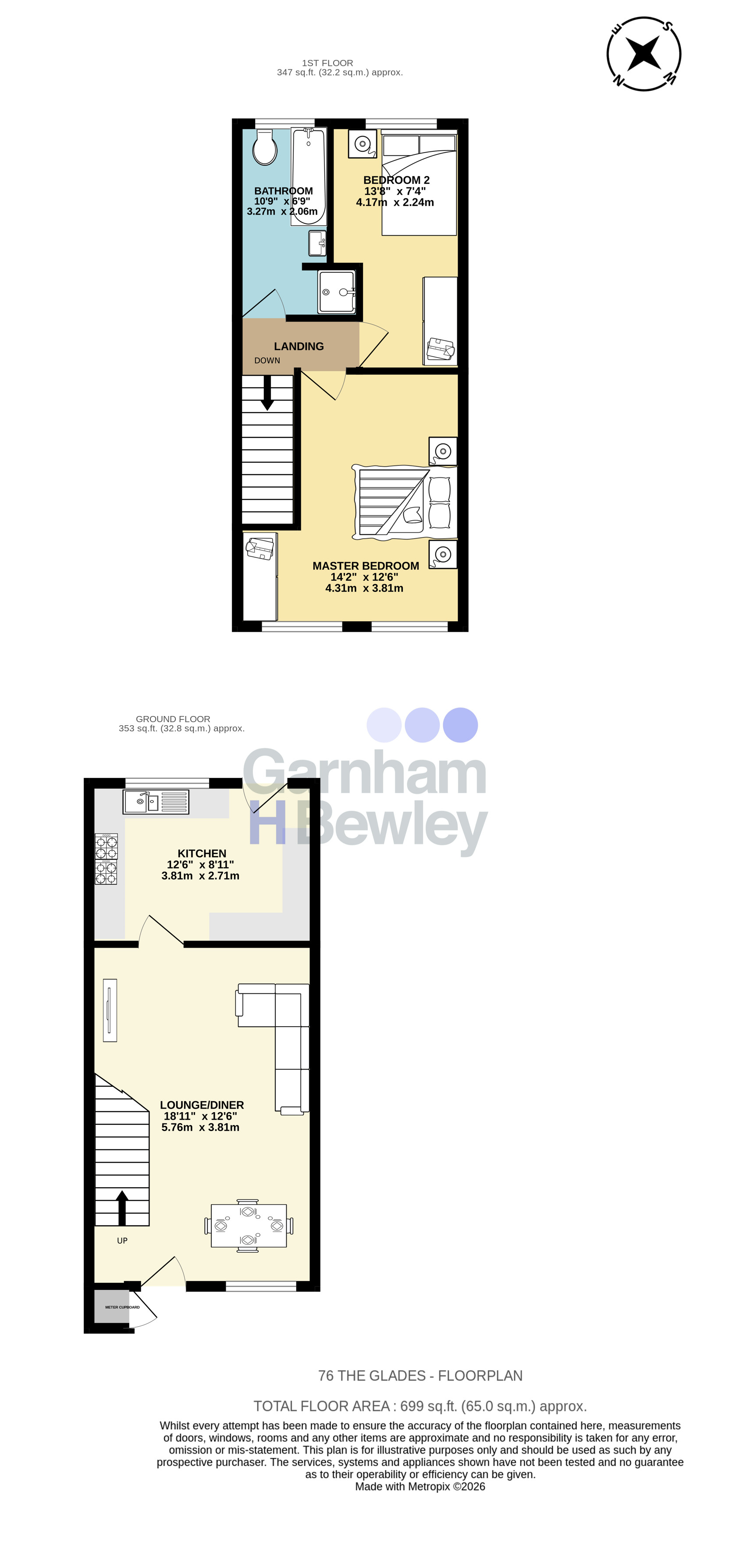 Upstairs, the property features two well-proportioned bedrooms. The generous principal bedroom spans the width of the house and provides excellent space for wardrobes and additional furnishings, while the second bedroom is ideal as a guest room, nursery, or home office. The family bathroom is particularly well-equipped, featuring both a bath and a separate shower, and is finished to a high standard.