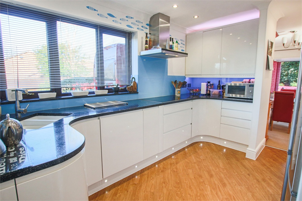 The ground floor consists of front door into entrance porch with door leading into the entrance hall which provides access to the downstairs shower room and stairs leading to the first floor. The kitchen has been fitted with a range of wall and base level units with areas of work surfaces, 1 1/2 bowl sink with drainer, integrated oven & dishwasher, electric hob, extractor hood above, dishwasher, wine cooler, space for fridge/freezer, under & over cupboard LED lighting, window to the front aspect and opening leads through to the dining room which has a window to the front aspect, bay window to the side and access to cupboard housing the boiler. The lounge has a window to the rear aspect and patio doors leading to the garden. There is also the utility set to the rear aspect with base level units, sink with drainer, space for washing machine, tumble dryer, door to side and door leading into the garage.