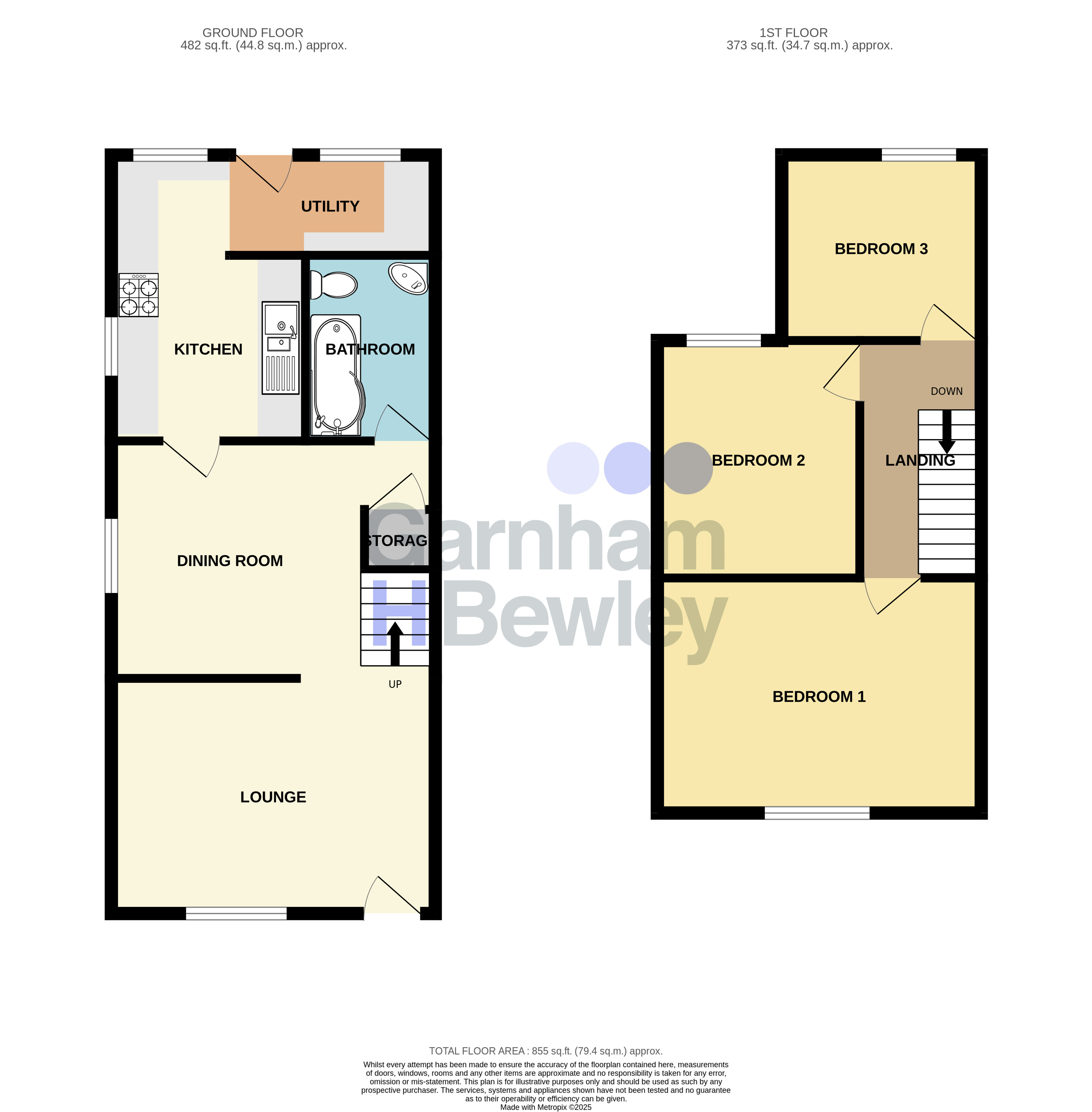 The ground floor features a bright and inviting living room with a front-facing bay window, separate dining room with useful under-stairs storage, an extended, modern fitted kitchen equipped with a range of wall and base units, a four-ring gas hob, electric oven, integrated dishwasher, and space for additional appliances, a practical utility room with base units, space for a washing machine and dryer, and access to the rear garden, contemporary family bathroom with WC, wash hand basin, heated towel rail, and bath with overhead shower