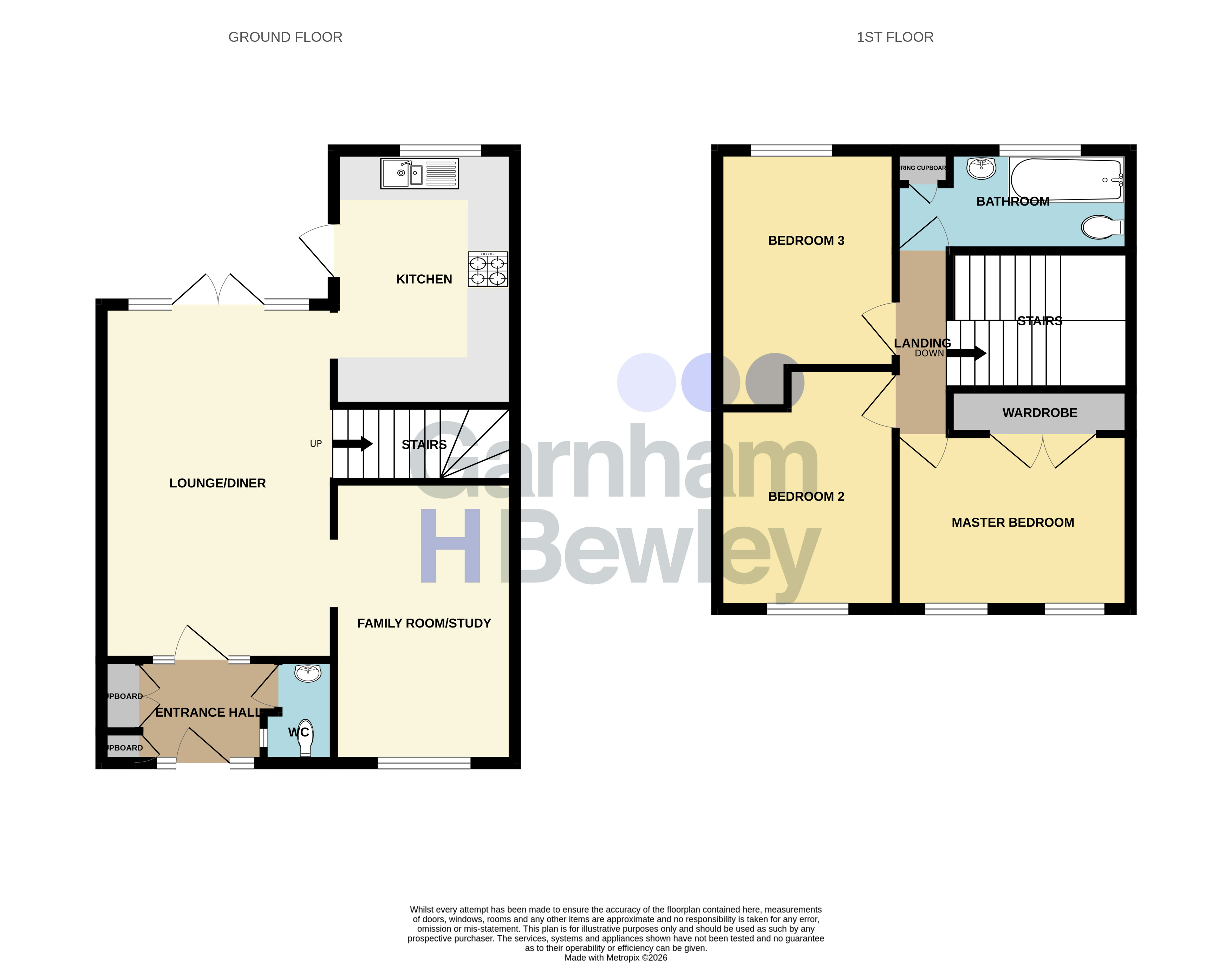 The property welcomes you into an extended porch, providing ample space for coats and shoes with built-in storage. It also has a conveniently located downstairs cloakroom with w/c. A glazed door leads into the spacious lounge/diner, which has been tastefully modernised to create a light, welcoming space. French doors open out to the rear garden, offering a seamless connection to outdoor living. Adjacent to the lounge is a large family room / study, beautifully presented with a feature bay window that floods the room with natural light. The family room / study also benefits from space for ample storage under the stairwell, making it a highly functional area. At the rear of the house is the thoughtfully designed kitchen, featuring sleek finishes. It comes complete with integrated fridge, freezer, cooker hood and dishwasher, and is additionally equipped with a gas cooker, washing machine and newly fitted gas boiler.