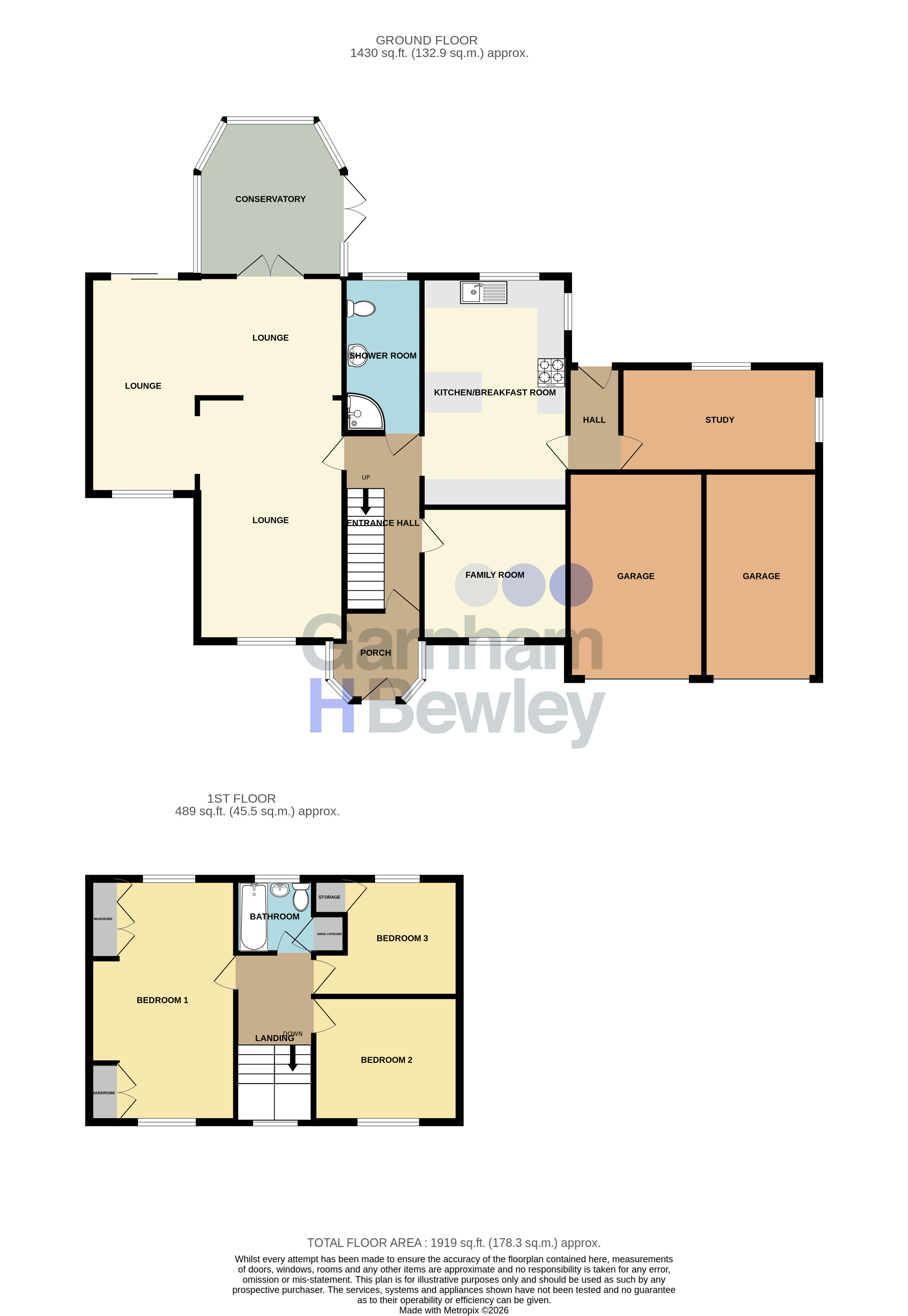 The first floor offers three well-proportioned bedrooms. The main bedroom enjoys double aspect windows and fitted wardrobes, while bedroom two is positioned to the front aspect. Bedroom three overlooks the rear garden and includes a built-in wardrobe. A family bathroom completes the accommodation on this level.