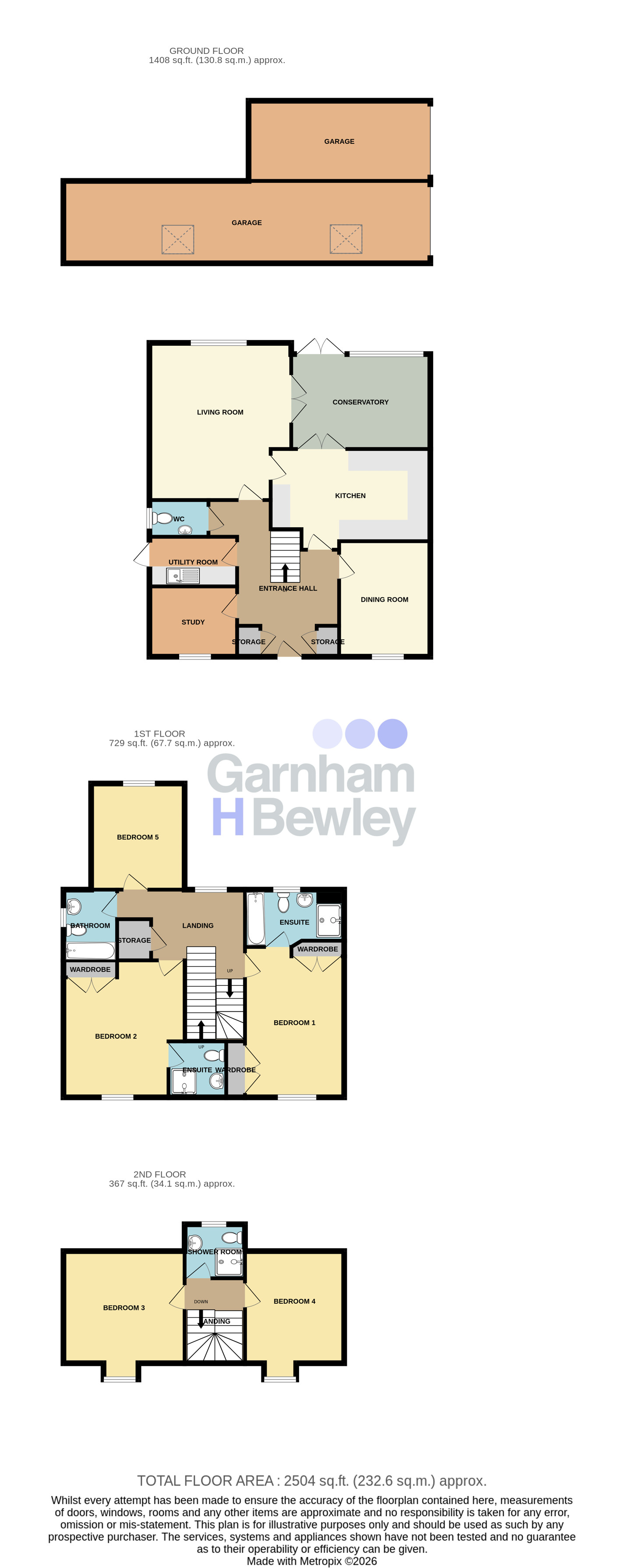 The ground floor includes a welcoming entrance hall with useful storage cupboards, leading to a comfortable lounge with glazed doors opening into the conservatory. The conservatory in turn connects to a well-appointed kitchen fitted with a double oven, hob, wall units, work surfaces, drawers and cupboards. A study, separate dining room, utility and downstairs W.C. are also located on the ground floor.