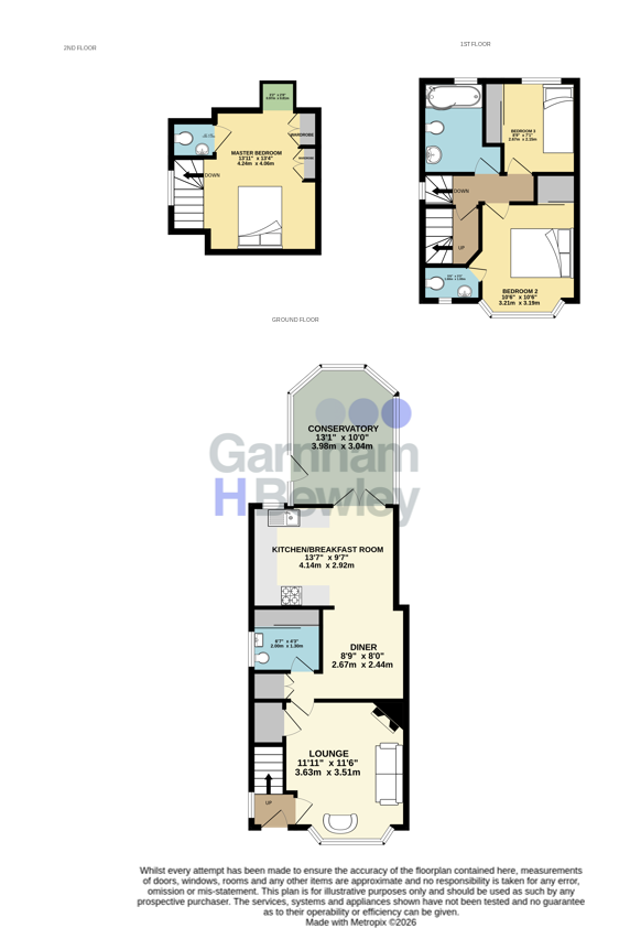 The ground floor offers a welcoming and well-balanced layout, featuring a separate lounge with a charming bay window and elegant plantation shutters. A stylish dining area flows seamlessly into the contemporary kitchen and breakfast room, which in turn opens into a spacious conservatory—flooded with natural light and overlooking the wonderfully private rear garden. A convenient downstairs WC and excellent storage complete this level.
