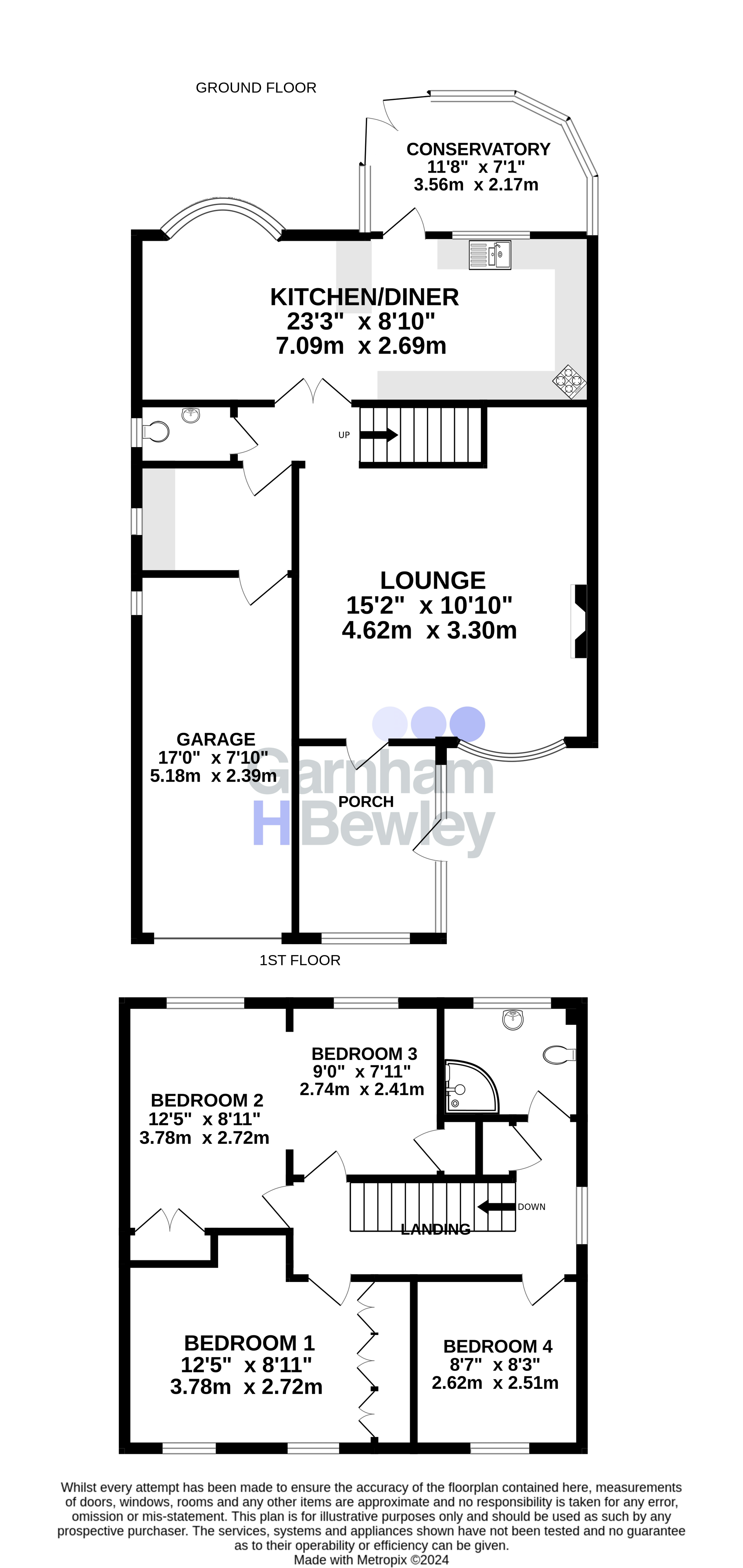 Garnham H Bewley are delighted to present this exceptional four-bedroom detached family home, ideally situated in the highly sought-after village of Crawley Down. Offering generous living space, well-maintained front and rear gardens, driveway parking, and a garage, this property is perfectly suited for modern family living. The ground floor opens with a welcoming reception porch leading into a bright and spacious living room. A charming bay window floods the space with natural light, complemented by a feature fireplace and ample room for comfortable furnishings—ideal for both relaxing and entertaining. To the rear, the property boasts an impressive kitchen/dining area, featuring a large bay window overlooking the beautifully landscaped garden and direct access to the conservatory. The well-appointed kitchen is fitted with a comprehensive range of wall and base units, generous worktop space, a breakfast bar, and a one-and-a-half bowl inset sink. Integrated appliances include a double oven and four-ring gas hob with extractor hood, with additional space for further appliances. Further ground floor benefits include a convenient WC and a practical utility room with internal access to the garage.